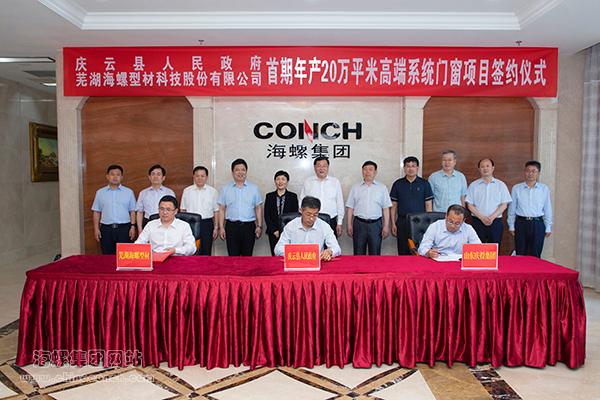 2020年6月2日,海螺型材與德州市慶云縣人民政府在海螺集團總部簽署了年產(chǎn)20萬平方米高端系統(tǒng)門窗項目協(xié)議。海螺集團黨委書記、董事長高登榜,集團副總經(jīng)理、海螺型材董事長萬涌,集團紀委書記吳小明,德州市副市長張桂愛等出席并見證簽約儀式。海螺型材總經(jīng)理王楊林、慶云縣縣長孫洪昌、山東慶投控股集團董事長王鐵峰現(xiàn)場簽約。