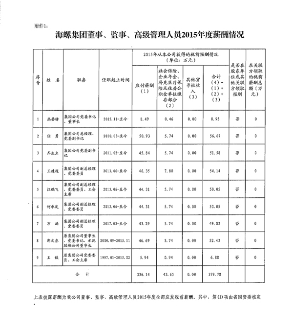 海螺集團(tuán)董事、監(jiān)事、高級(jí)管理人員2015年度薪酬情況