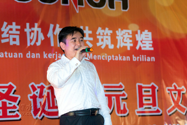 “你到我身邊,帶著微笑,流金的歲月,把你從遠(yuǎn)方帶到我的身旁”PT.SULENCO BOHUSAMI CEMENT公司董事長(zhǎng)卓瑞瑞的一首《遲到》,在公司總經(jīng)理曾國(guó)華的即興伴舞下,把晚會(huì)氣氛推向一個(gè)新的高潮,掌聲、歡呼聲、吶喊聲,聲聲不絕,渲染了晚會(huì)歡樂(lè)的氣氛。