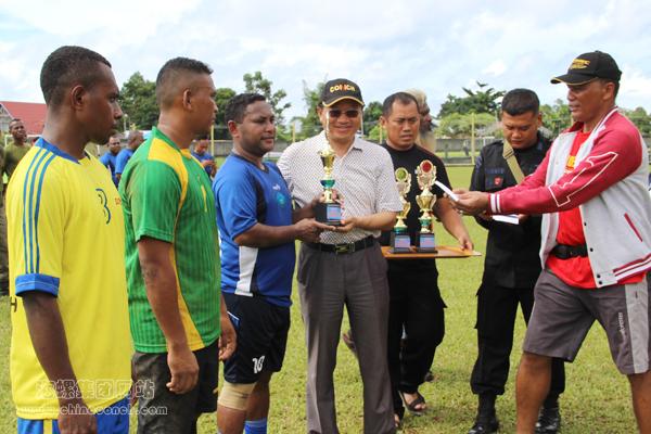 一波舞蹈高潮之后,首屆“海螺水泥杯”足球友誼賽總決賽拉開戰(zhàn)幕。經(jīng)過緊張的爭奪,最終,PEMDA(縣政府代表隊(duì))隊(duì)以5:1的絕對優(yōu)勢,力克對手,奪得冠軍。